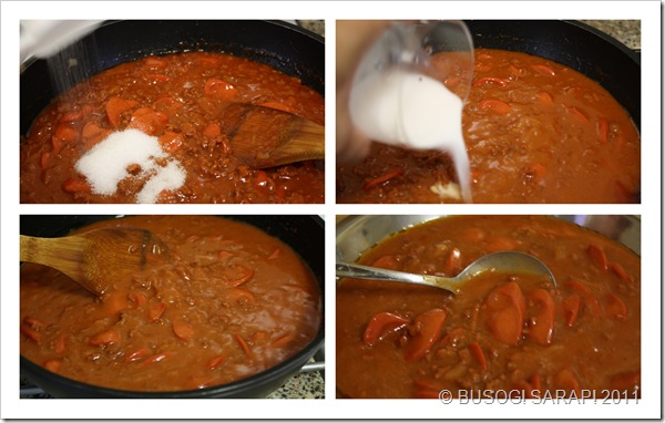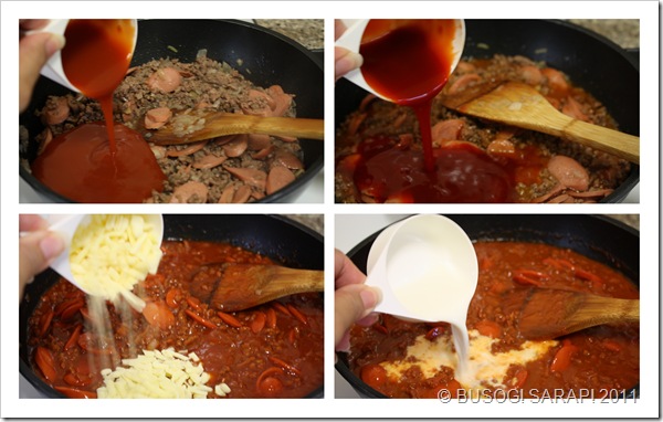 ~ Pour in your tomato sauce, ketchup, water, cheese and milk. Stir the sauce well on each addition. Reduce the heat to simmering stage.