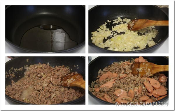 ~ In medium-high, heat your cooking oil in a large frying pan and sauté your garlic and onions till they become transparent. Add in your mince beef and while stirring, make sure you break down the meat clumps. Throw in a good pinch of salt and pepper over the mince beef. Once the mince beef are all evenly browned, add in your sliced hotdogs and cook further for a 15-30 seconds.